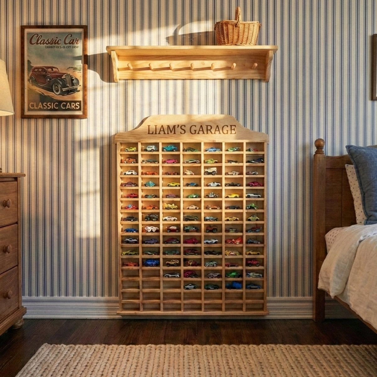 Room for every car in the collection. Our largest garage holds 105 diecast cars in individual cubbies — wall-mounted, personalized, and built to grow with your little collector.